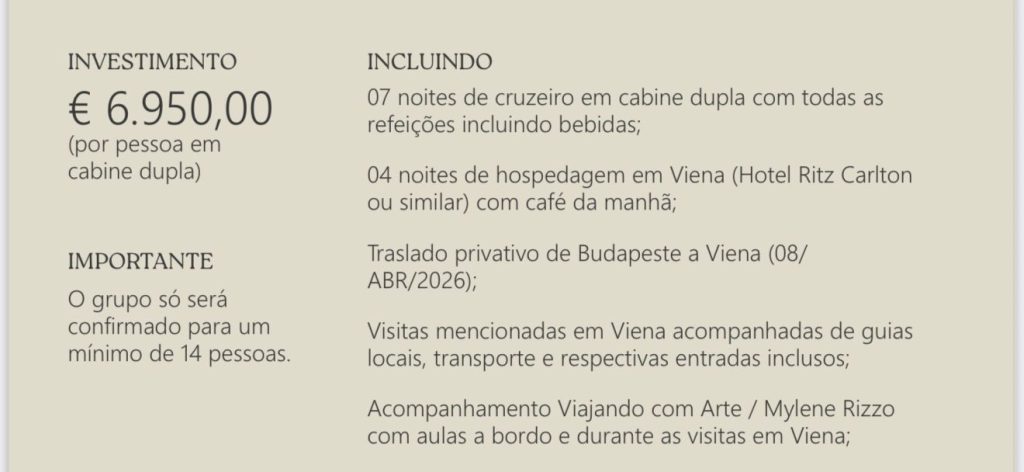 Ao final, quatro noites em Viena, para vivenciar com calma a elegância da capital austríaca e mergulhar no espírito da Secessão Vienense, movimento que teve em Gustav Klimt seu expoente máximo — onde o ouro se fez arte e a arte se fez eternidade.